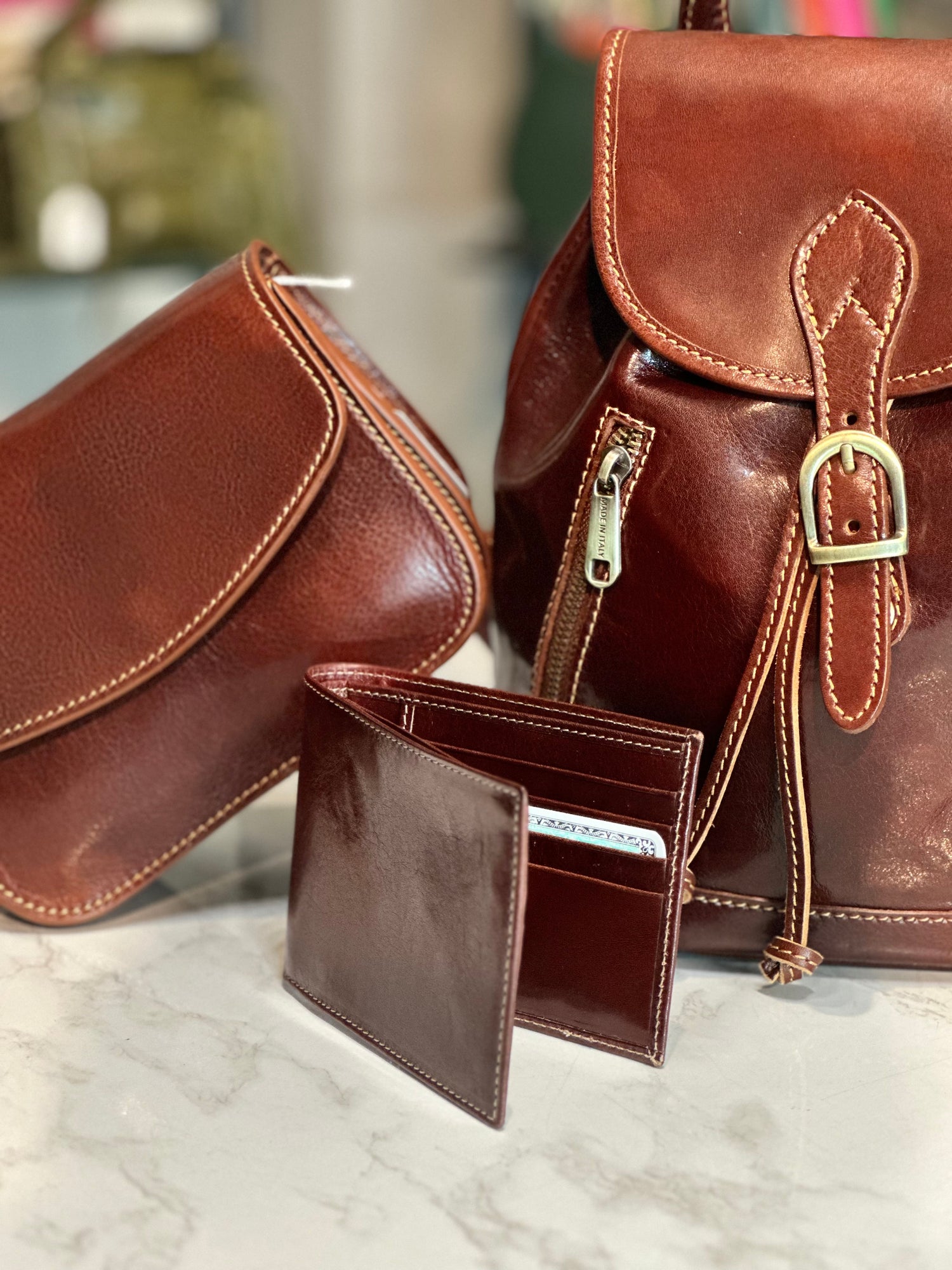 Borsello in cuoio fiorentino con tre tasche esterne.
